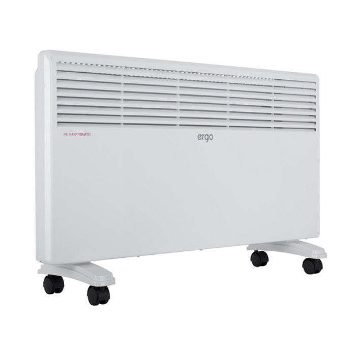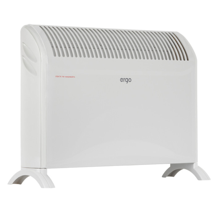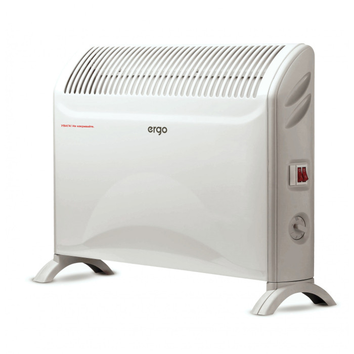 Електричний конвектор ERGO HC 202020 з відкритим нагрівальним елементом типу Zig-zag має два рівні потужності – 1000/2000 Вт, що дозволяє пристосувати його для обігріву приміщень площею до 20 м.кв. Конвектор може підтримувати певну температуру у поміщенні завдяки механічному термостату. Прилад може бути встановлений на підлозі за допомогою спеціальних опор, що входять до складу комплекту обігрівача.