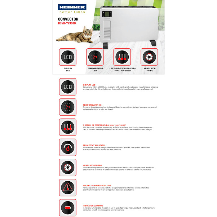 Електричний обігрівач Heinner HCVH-Y2300D являє собою потужну, надійну, економічну та високоефективну станцію для швидкого нагрівання та підтримки комфортної температури в будь-якому приміщенні до 25 кв.м-з центральним опаленням або без нього. У представленій моделі ковектора передбачено 3 режими потужності: 1000 Вт / 1300 Вт / 2300 Вт, що дозволяє ефективніше обігрівати приміщення. Крім того, вбудований електронний термостат дає Вам можливість повністю автоматизувати процес обігріву та економити до 30% електроенергії.