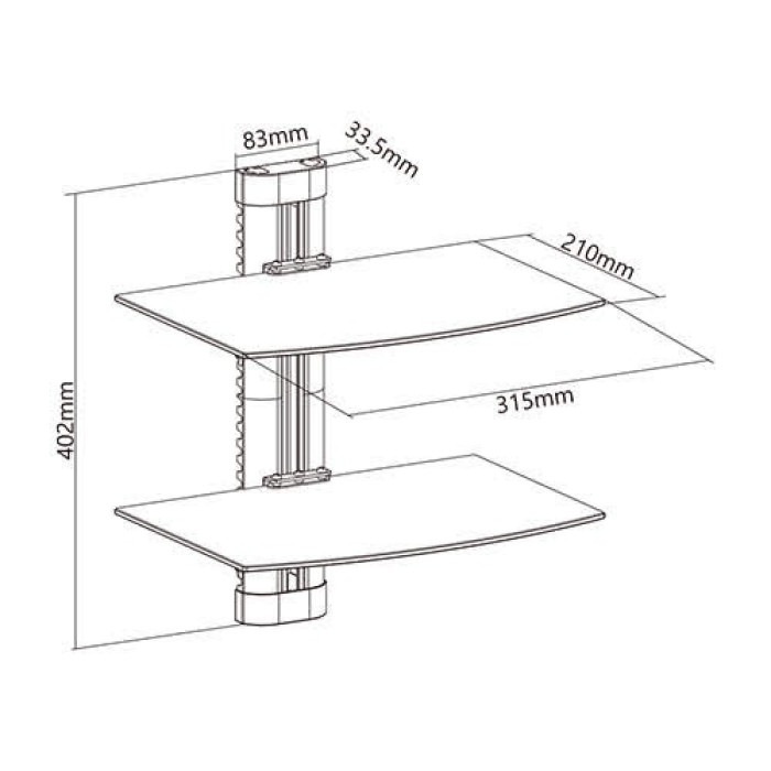 Настінний кронштейн для відео та аудіоапаратури вагою до 8 кг з 2 скляними полицями та кабель-каналом.