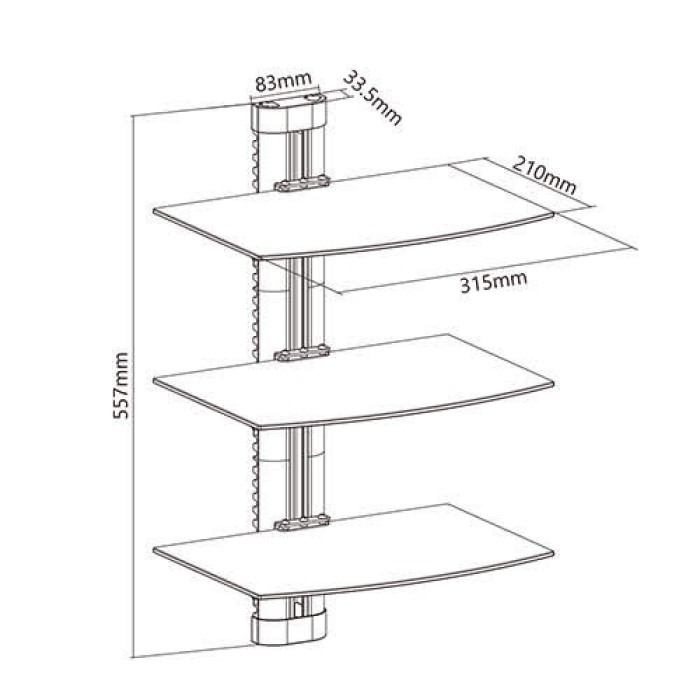 Настінний кронштейн для відео та аудіоапаратури вагою до 8 кг з 3 скляними полицями та кабель-каналом.