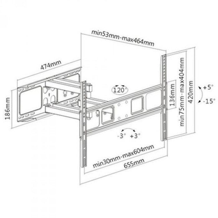 Настінне кріплення дозволяє закріпити на стіні LCD панель діагоналлю 37"-70" вагою 50 кг. Конструкція ITECH PTRB49 дозволяє повертати телевізор на 120° та змінювати кут нахилу -20°/+10°.