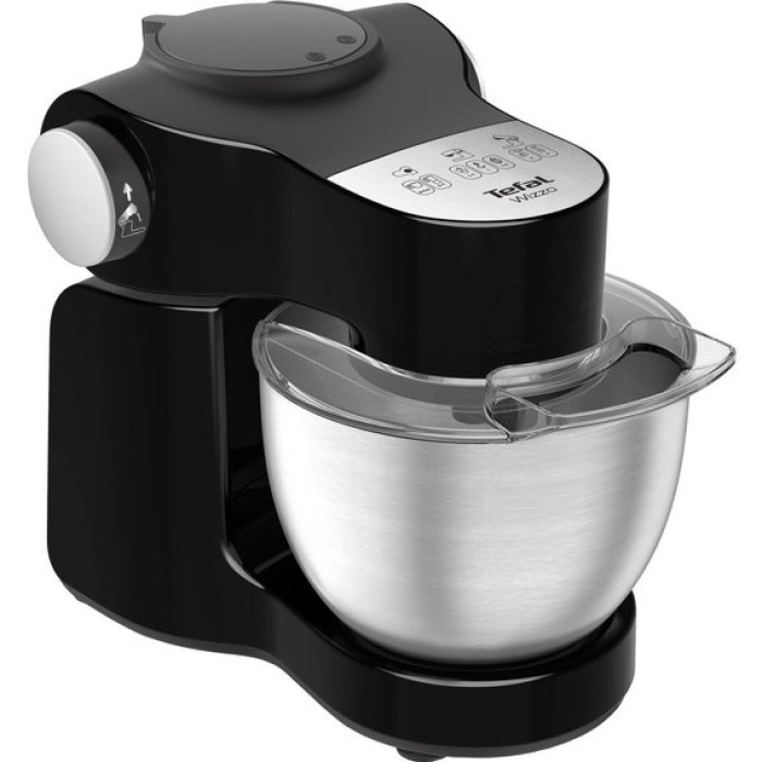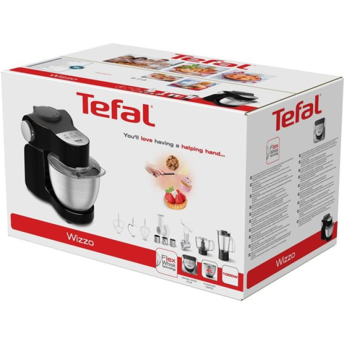 Кухонна машина Tefal Wizzo QB319838 – багатофункціональний стаціонарний агрегат, виготовлений у чорному кольорі та елегантному стильному дизайні. Завдяки різним насадкам вона замінює цілу низку приладів, таких як блендер, подрібнювач, м'ясорубка та слайсер. У моделі застосовується ексклюзивна технологія Flex Whisk, за допомогою якої виготовляється швидке збивання білків, у тому числі з одного яйця. Продукти для приготування страви викладаються в чашу із нержавіючої сталі із захистом від бризок об'ємом 4 літри. Встановлений двигун потужністю 1000 Вт з 7 регульованими швидкостями та імпульсним режимом виконує планетарне обертання насадок. При такому русі насадка обертається по колу чаші і одночасно навколо осі і досягається якісне однорідне перемішування. Керується кухонна машина Tefal Wizzo QB319838 ергономічними електронними кнопками.