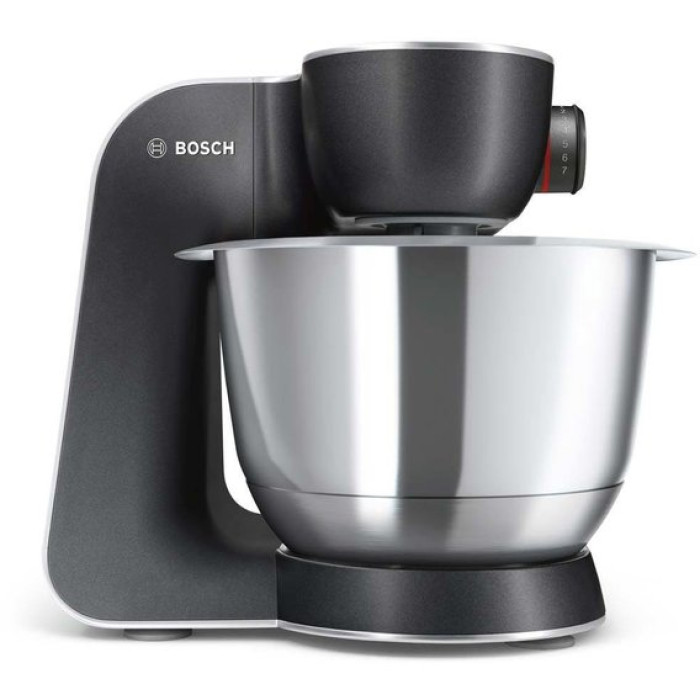 Кухонна машина Bosch MUM58M59 є багатофункціональним стаціонарним мережевим приладом. У ній застосовано продуктивний двигун потужністю 1000 Вт, здатний виконувати планетарне обертання насадок – 3D PlanetaryMixing. Такий метод дозволяє змішувати інгредієнти швидко та якісно. Швидкість обертання двигуна регулюється сімома рівнями, а крім того, він може працювати в імпульсному режимі. Продукти для обробки поміщаються в чашу об'ємом 3,9 літра з нержавіючої сталі або пластикову чашу блендера ємністю 1,25 літра. Модель укомплектована великою кількістю насадок, що розширює її можливості. Зміна насадок проводиться за допомогою системи Easy Arm Lift, що забезпечує легке підняття універсального кріплення кріплення. Серед аксесуарів можна відзначити шнекову м'ясорубку, прес для цитрусових, різні види терок і шатківниць, віночки для збивання і гак для замісу тіста. Кухонна машина Bosch MUM58M59 встановлена на гумові ніжки-присоски та обладнана захистом від перегріву, а для зберігання насадок є зручна сумка.