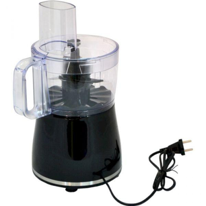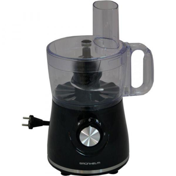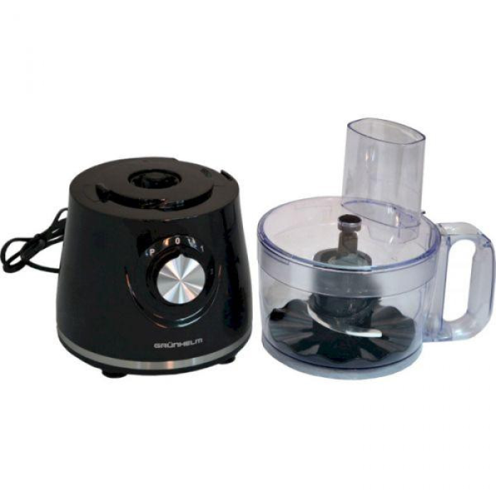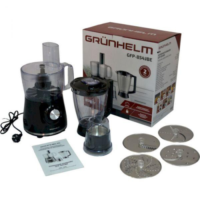 Кухонний комбайн Grunhelm GFP-854JBE є багатофункціональним пристроєм, який швидко і якісно обробляє продукти для приготування різноманітних страв. Він виготовлений у сучасному дизайні у строгому чорному кольорі. Моторний блок приладу обладнаний електродвигуном потужністю 850 Вт, що працює на двох швидкостях та в турборежимі. Модель укомплектована набором насадок, серед яких пластикова чаша об'ємом 1,2 літра з ручкою, кришкою та отвором із штовхачем для подачі інгредієнтів. Крім того, є блендер з чашею із пластику ємністю 1,75 літра, млин для кави та спецій, а також віночок для збивання та насадка для замісу тіста. Ріжучими інструментами є три дискові терки різного профілю та шатківниця. Кухонний комбайн Grunhelm GFP-854JBE встановлений на ніжки, тому стійкий на будь-якій кухонній поверхні.