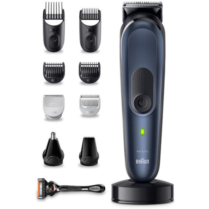 2 регульовані насадки-гребеня (3-11, 13-21 мм), гребені (1 мм і 2 мм), насадка точковий триммер, насадка для носа та вух, насадка триммер для тіла, насадка для чутливих ділянок тіла, косметичка, підставка, санок Gilette, щіточка для чищення
