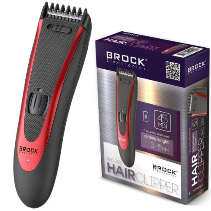 Машинка для стрижки, автономне харчування, час роботи 45 хв, лезо з нержавіючої сталі, 1 насадка, довжина стрижки 3-15 мм, регулювання довжини за допомогою поворотної кнопки, щіточка, масло, адптер живлення