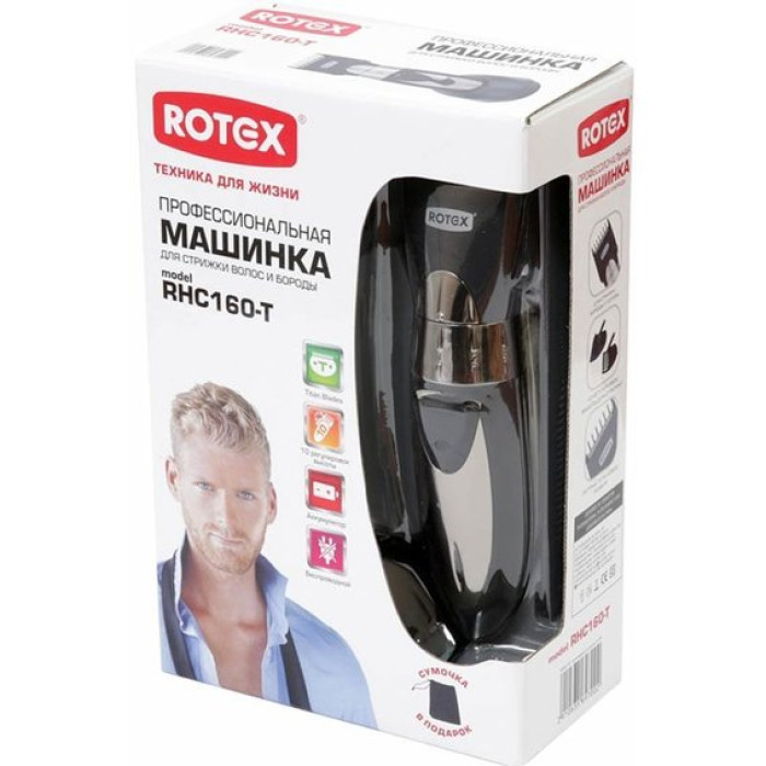 З машинкою для стрижки волосся Rotex RHC160-T працювати легко і приємно, адже вона має не тільки ергономічний сучасний дизайн, але й хороший функціонал, що дозволяє легко експериментувати над своїм чином. У наборі з триммером є дві регульовані пластикові насадки 4-16 та 18-30 мм, а для стрижки волосся коротше 4 мм використовуйте прилад без насадок. Титанові леза не вимагають заточування та зберігають гостроту протягом усього терміну служби. Тример Rotex RHC160-T працює від акумулятора, що забезпечує до 40 хвилин стрижки. А в комплекті з інструментом Ви також знайдете базу з адаптером для зарядки, мішечок для транспортування, олію та щіточку для догляду.