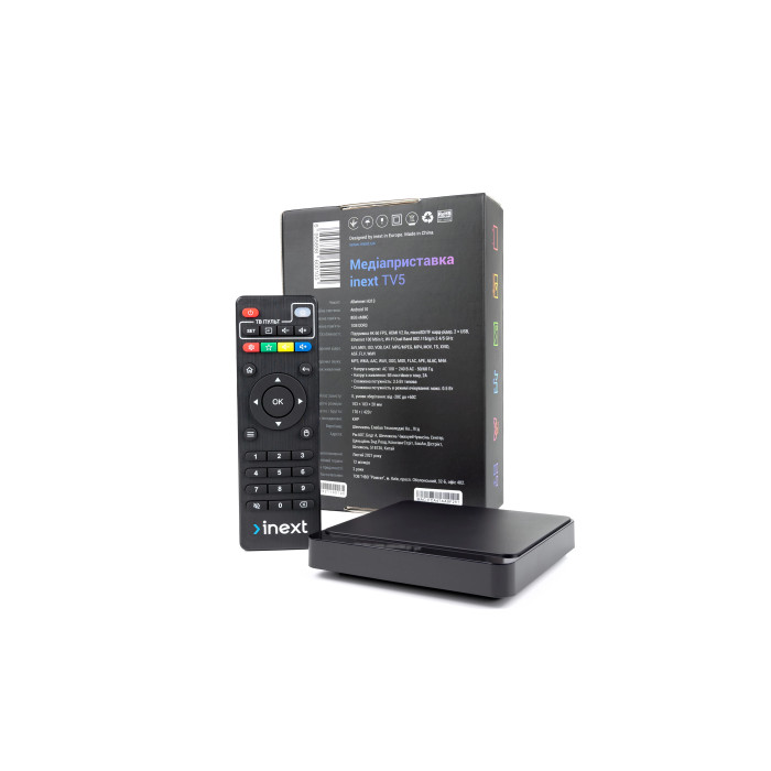 inext TV5 - медіаплеєр з операційною системою Android 10, новим потужним чипсетом Allwinner H313, дводіапазонним модулем WiFi 2.4/5 GHz і можливістю перегляду відео контенту у форматі 4K UHD. Об'єм вбудованої пам'яті становить 8 ГБ, а оперативної пам'яті - 1 ГБ (DDR3). Пристрій створений для комфортного перегляду відео-, фото- та аудіо контенту, має багатий функціонал і широкі можливості підключення.