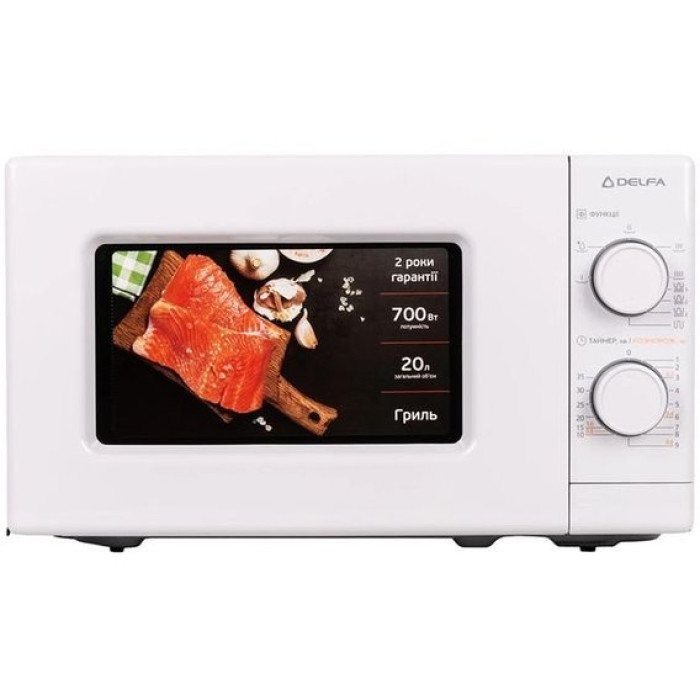 Мікрохвильова піч Delfa MD202MGW являє собою чудову модель, що поєднує високу якість, функціональність, гарний дизайн і вигідну ціну. Потужний прилад має гарну місткість на 20 л і допоможе швидко розігріти, розморозити або приготувати будь-яку страву. Режим гриля і розморожування збільшує можливості даної моделі і дозволить приготувати чудове м'ясо, піцу або овочі. Використовуйте різні рівні потужності, щоб приготувати улюблені страви ідеально і швидко. Мікрохвильова піч бездоганно справляється зі своїми основними завданнями завдяки високій потужності мікрохвиль, що становить 700 Вт. Для досягнення чудового результату приготування доступно 9 рівнів потужності, з яких ви легко зможете вибрати найоптимальніший. Точність контролю управління рівнем потужності гарантує рівномірне прогрівання продуктів будь-якого обсягу.