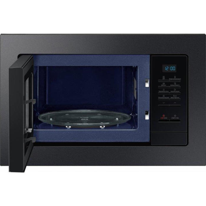 Вбудована мікрохвильовка Samsung MS20A7013AB/UA виконана в сучасному дизайні в стильному і практичному чорному кольорі. Максимальна споживана потужність пристрою об'ємом 20 літрів становить 1250 Вт. Робоча камера приладу покрита високоміцною керамікою і обладнана поворотним столом діаметром 255 мм, а її дверцята відкриваються натисканням кнопки. Застосоване джерело НВЧ-випромінювання має потужність 850 Вт, яка регулюється шістьма рівнями. Створювані ним мікрохвилі розподіляються системою TDS у трьох напрямках. Така технологія забезпечує повне охоплення всього внутрішнього простору, і глибоке проникнення в їжу з усіх боків для ефективного прогрівання. Модель оснащена автоматичними програмами приготування страв, а також 5-варіантною функцією швидкого розморожування продуктів Quick Defrost. Є зручний режим 30-секундної роботи, який активується одним натисканням. Управляється мікрохвильовка Samsung MS20A7013AB/UA електронними кнопками.