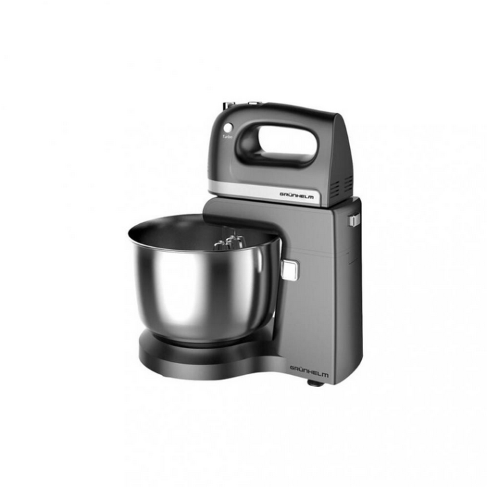 Міксер Grunhelm GRM662B виготовлений у сучасному дизайні у строгому чорному кольорі. Усі його складові виконані з плавними лініями форм і виглядають стильно та елегантно. Конструкція пристрою дозволяє застосовувати його як стаціонарним, і ручним способом. На його основі надійно фіксується знімний моторний блок із двома насадками та встановлюється чаша об'ємом 3,5 літра з нержавіючої сталі. У моторному блоці розташований електродвигун потужністю 500 Вт з ефективною системою охолодження, що працює на п'яти швидкостях та в турбо режимі. Як насадки використовуються два віночки для збивання і пара гаків для замісу тіста. Вони легко та просто від'єднуються натисканням спеціальної кнопки. Великою зручністю для користувача є автоматичне обертання чаші, що дозволяє звільнити руки. Міксер Grunhelm GRM662B підключається до мережі напругою 220 В частотою 50 Гц за допомогою шнура живлення довжиною 1,1 метра.
