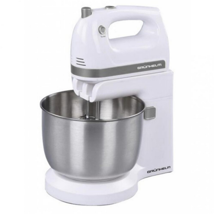 Міксер Grunhelm GRM662W випускається в сучасному лаконічному дизайні у пластиковому корпусі білого кольору із сірими деталями. Конструкторське виконання приладу дозволяє використовувати його як стаціонарно, так і вручну – його моторний блок встановлюється на настільну підставку. Модель обладнана електродвигуном потужністю 500 Вт, який працює на п'яти швидкостях та в режимі турбо. Продукти для обробки викладаються у чашу з довговічної та гігієнічної нержавіючої сталі об'ємом 3,5 літри. Як насадки застосовуються два віночки для збивання і пара гаків для замісу тіста. Вони надійно фіксуються та легко від'єднуються натисканням спеціальної кнопки. Міксер Grunhelm GRM662W зручний у використанні та полегшить виконання рутинних операцій при готуванні їжі. Міксер Grunhelm GRM662W зручний у використанні та полегшить виконання рутинних операцій при готуванні їжі.