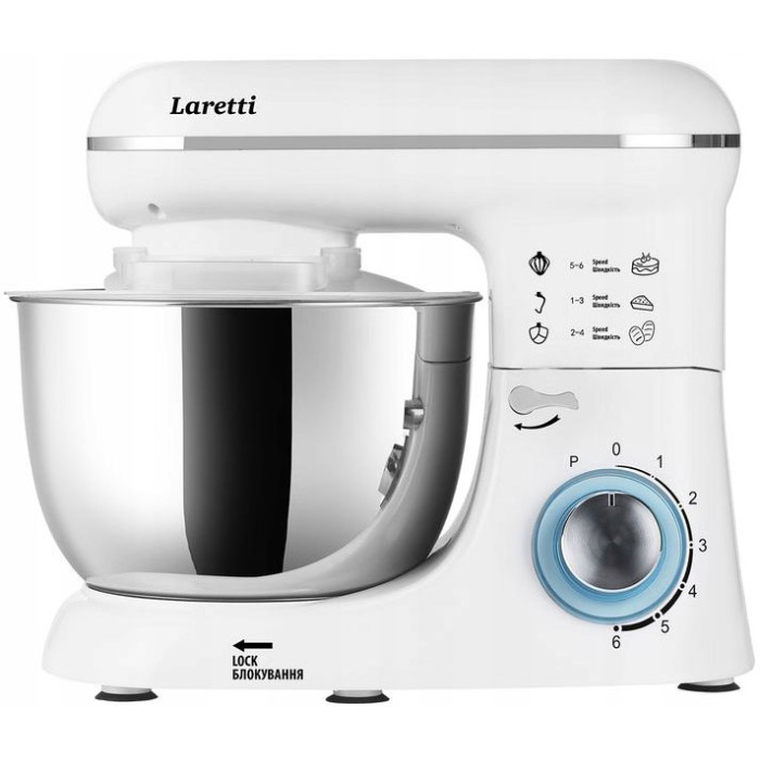 Стаціонарний міксер потужністю 1300 Вт з 6 режимами та планетарною системою змішування. Оснащений чашею об'ємом 4,5 л. У комплекті - віночки для збивання, гаки для тіста та пінозбивач. Корпус виготовлений із пластику. Колір – білий.