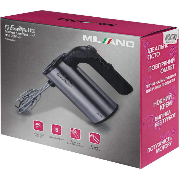 Milano HM-7002SB EaseMix Plus - це міксер, створений для тих, хто цінує якість, естетику та зручність. Його вишуканий дизайн у кольорі нержавіючої сталі з чорними акцентами додає сучасного вигляду та довговічності, роблячи цей прилад чудовим вибором для будь-якої кухні.