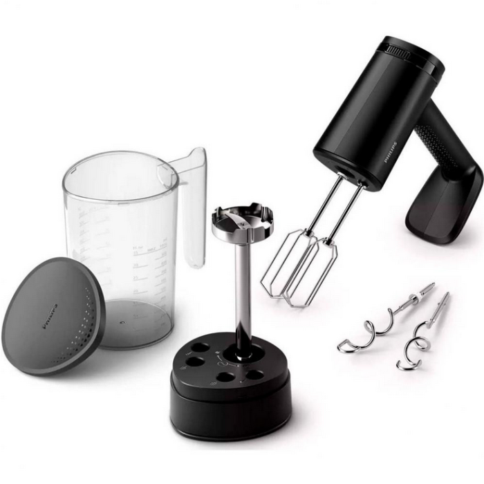 Цей ручний міксер 2 в 1 замішує навіть густе тісто за короткий час. Мінімальне розбризкування та очищення, а також зручний доступ навіть у куточки глибоких місткостей завдяки довгому стрижню та функції Soft Start. З насадкою блендера, а також склянкою для зберігання.