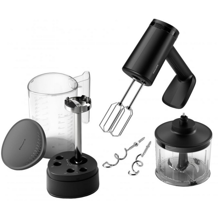 Цей ручний міксер 3 у 1 замішує навіть густе тісто за короткий час. Мінімальне розбризкування та очищення завдяки довгому стрижню та функції Soft Start. З насадками блендера та подрібнювача, а також склянкою для зберігання. 5 режимів швидкості та турборежим для будь-яких завдань змішування