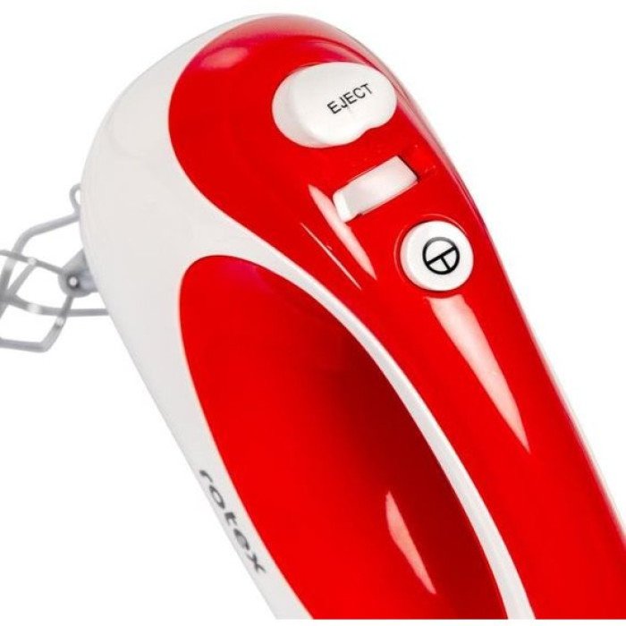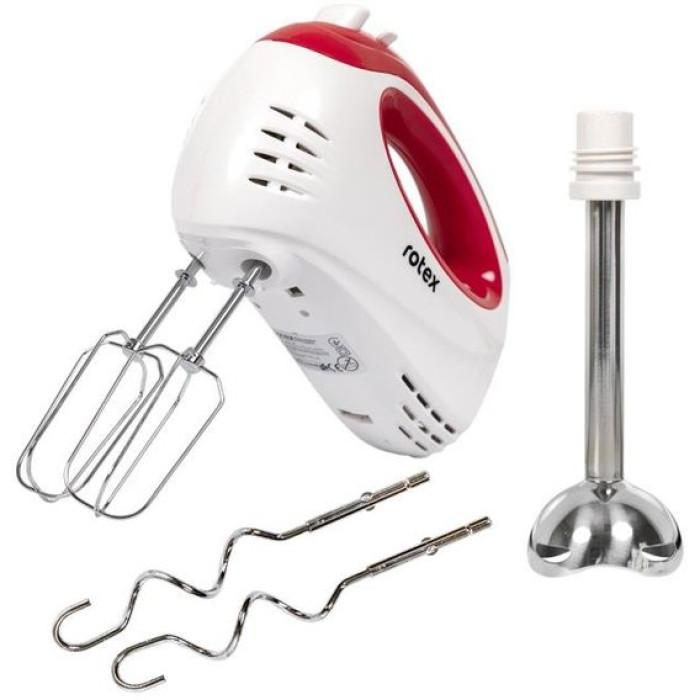 Модель Rotex RHM200-K має розширені можливості, тому що в його комплектації, крім стандартних віночків для збивання та гаків для замішування тіста, передбачено ще ніжку блендера.
