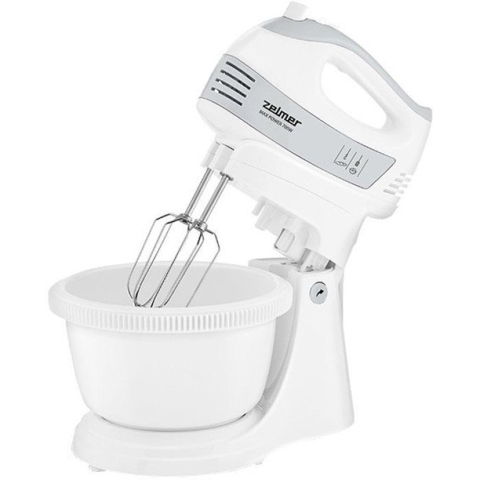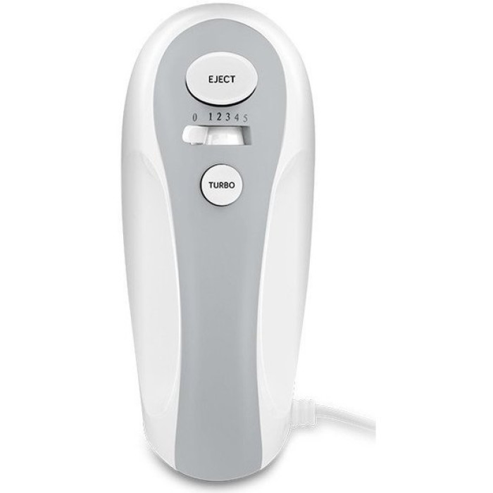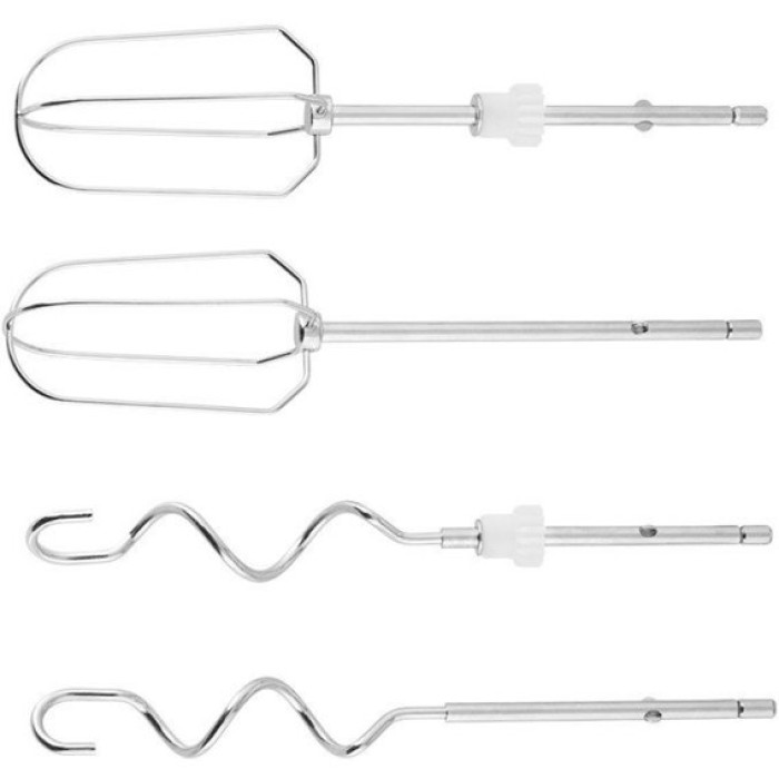 Наш міксер потужністю 700 Вт оснащений обертовою чашею об'ємом 2.5 л, що самостійно і ретельно змішує всі додані інгредієнти. Пристрій має 5 швидкісних режимів та функцію турбо, що дозволяє швидко та ефективно змішувати продукти. Завдяки покриттю soft touch на ручці міксер міцно тримається в руці та зручний у використанні. До складу пристрою також входять два віночки та гаки для тесту.