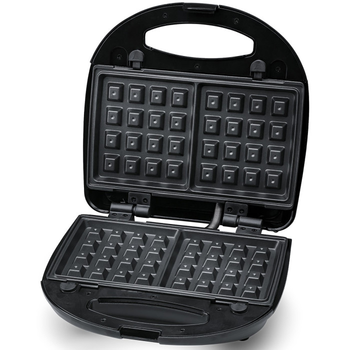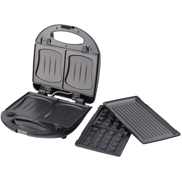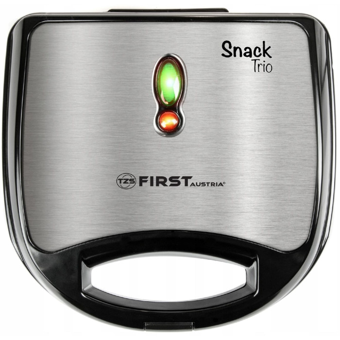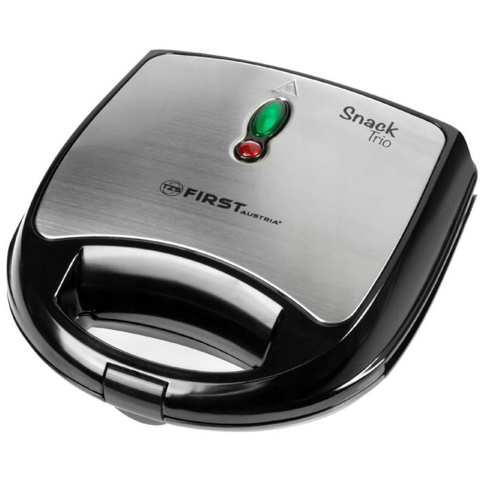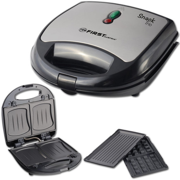 Мультимейкер FIRST FA-5342 має 2 відділення для випічки сендвічів, а також знімні алюмінієві пластини з антипригарним покриттям для випічки гриля і вафель. Завдяки наявності ручок, що не нагріваються, пристрій максимально безпечний. Потужність пристрою складає 750 Вт.