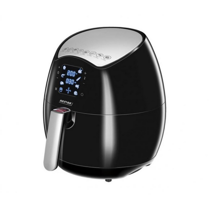 Компактна мультипіч (аерофритюрниця) MPM Product MFR-06 чорного кольору призначена для приготування різноманітних страв з мінімальною кількістю або зовсім без додавання жиру або олії.Функціональний прилад розроблений із електронним дисплеєм та сенсорними перемикачами, за допомогою яких можна вибрати одну з 8 автоматичних програм приготування та інші параметри моделі.Вбудований термостат забезпечує регулювання температурного режиму від 80°C до 200°C з кроком 5°C.Вентилятор створює циркуляцію гарячого повітря, забезпечуючи рівне нагрівання по всьому внутрішньому об'єму для отримання рум'яної та хрусткої скоринки зовні та ніжної та соковитої м'якоті всередині.Пристрій потужністю 1500 Вт обладнано місткою чашею з антипригарним покриттям ємністю 4,5 літра та кошиком об'ємом 2,8 літра.Щоб точно задавати час приготування, мультипіч (аерофрітюрниця) MPM Product MFR-06 оснащена електронним таймером на 30 хвилин з кроком 1 хвилина.