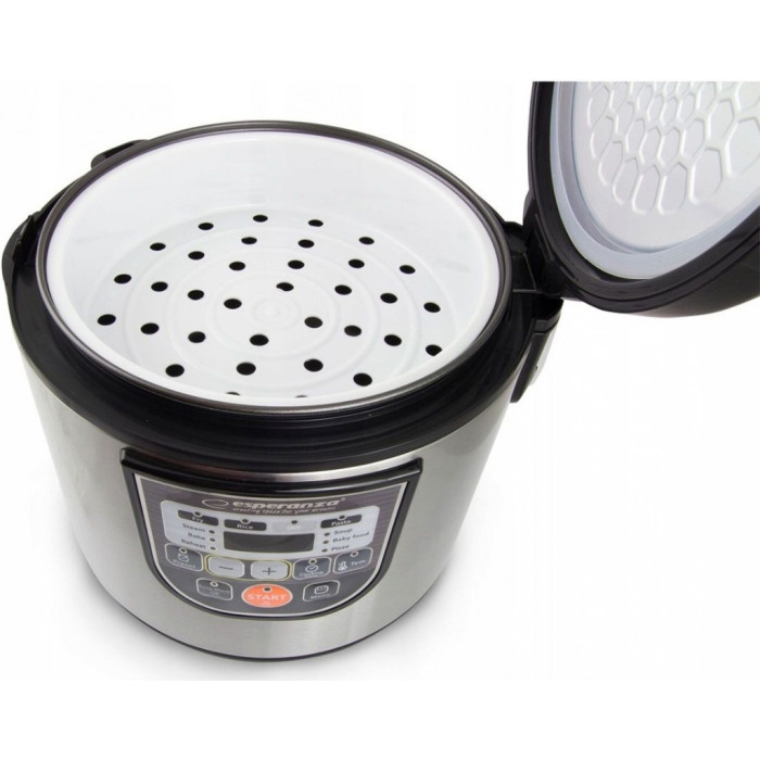 Esperanza на 5 л EKG011 – гідна модель, що дозволяє значно вдосконалити побут сучасної господарки. Її основна перевага та головна відмінна риса – наявність чималої кількості програм. Вона може приготувати навіть тушковане м'ясо, риба, овочі, рис, макарони, картопля, різну випічку. Esperanza на 5 л EKG011 має в комплектації 5-літрову чашу, черпак, мірну чашку та корисні пристрої. Для Вашої зручності та безпеки, в неї вбудований режим відстрочення старту, блокування кришки, захист від перегріву та нестачі води, автоматичне вимкнення. Має стильний сріблястий-чорний колір, зручна у використанні, компактна та багатофункціональна.