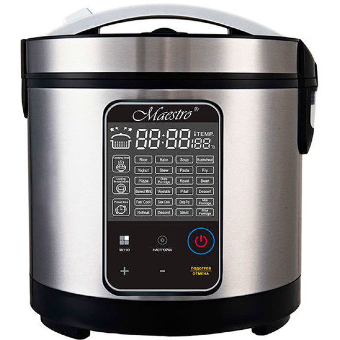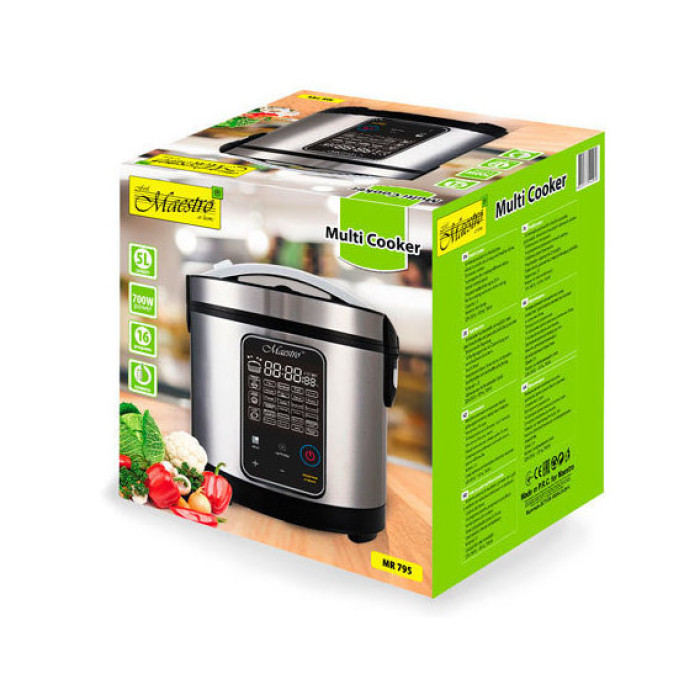 Практична та зручна мультиварка Maestro MR795 – проста в експлуатації модель, яка допоможе Вам приготувати безліч страв, замінивши відразу кілька приладів. Maestro MR795 пропонує для роботи 5 л чашу та 33 різноманітні програми для приготування, вибрати які Ви зможете за допомогою зрозумілої електронної панелі керування. Крім стандартних програм для приготування каш, перших супів, макаронів, випічки, гасіння та варіння на пару, в ній є програми для підсмажування, йогурту, холодця, дитячого харчування, розморожування та джемів. Також Ви зможете готувати у фритюрі та запікати у фользі. У Maestro MR795 є функція мультикухар, в якій можна вибрати свої параметри, можливість підтримання температури до 12 годин, а також таймер відстрочення до 24 годин.