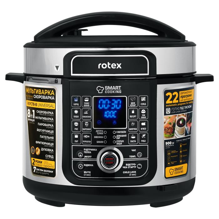 Rotex REPC78-B - мультиварка-скороварка з широким функціоналом у лінійці Rotex.Єдина скороварка з можливістю керування багатофункціональним джойстиком.Вона укомплектована чашею 5 л із подвійним антипригарним покриттям.Функціонал Smart Cooking робить цю модель зручною та сучасною помічницею на кухні, до нього входить: регулювання часу та температури приготування, керування автопідігрівом, блокування від дітей, відключення звуку.Збільшений трисмуговий LED-дисплей одночасно показує всі налаштування.Серед 22-х автоматичних програм є нові: СУВІД, ПАСТА, РИС, ОВСЯНКА, СТЕРИЛІЗАЦІЯ, М'ЯСО, РИБА.Одна мультиварка – для всіх кулінарних завдань!