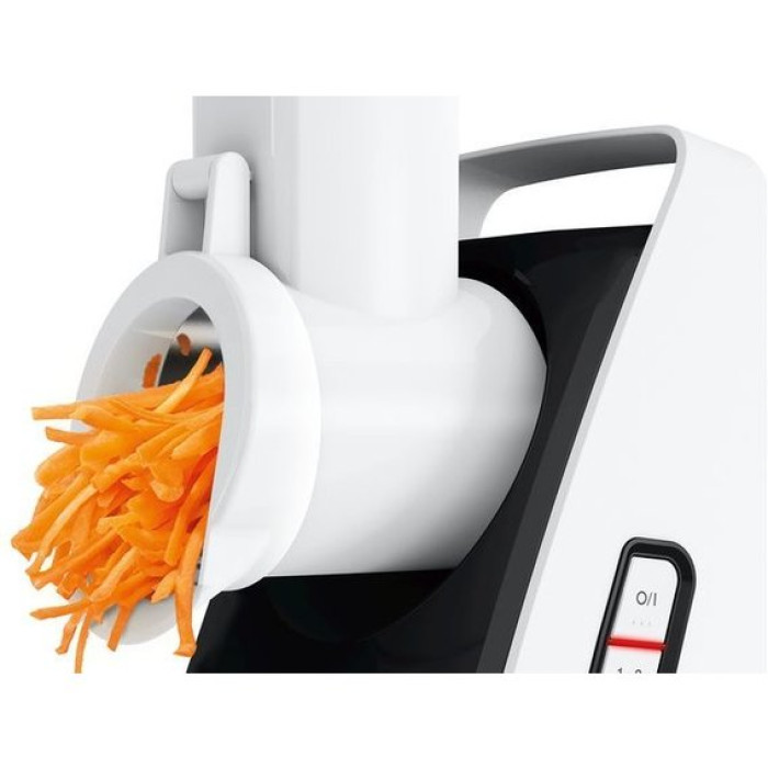 Функціонал м'ясорубки Bosch MFW3X13B доповнений насадками для приготування ковбасок, а також 3 насадками-терки і приставкою-овочерізки. Це вказує на багатофункціональність пристрою: з його використанням можна подрібнювати овочі для заготовок, робити домашні ковбаски і ін. Для зберігання насадок і шнура в корпусі передбачені спеціальні відсіки. Ручка для перенесення і прогумовані ніжки сприяють зручності використання, зберігання і транспортування.