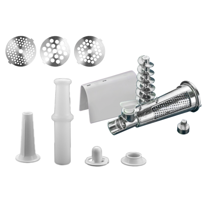 3 диска для помелу (3 мм/5 мм/7 мм), насадка для ковбас, насадка для кебе, соковитискач для томатів, штовхач