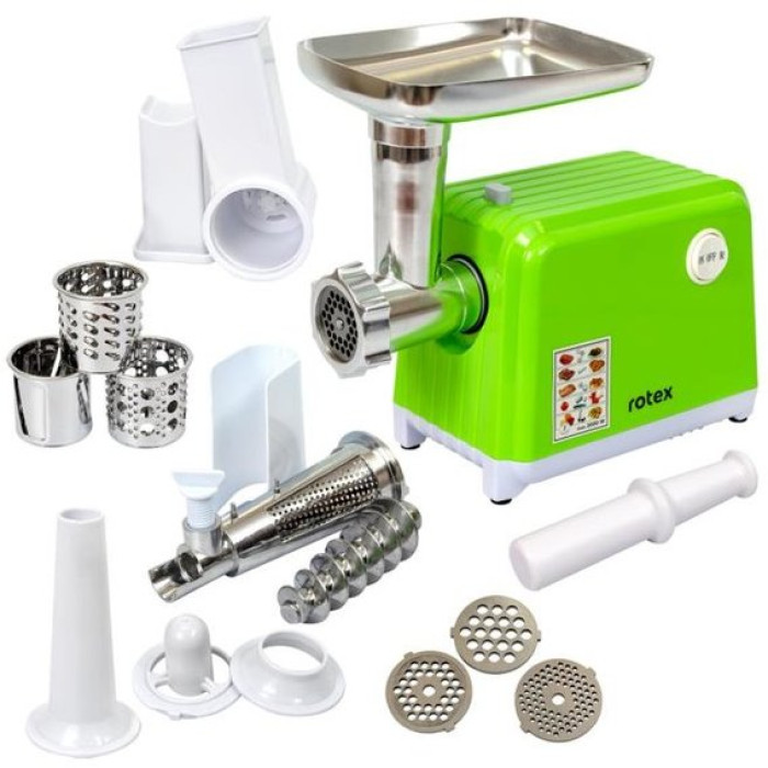 М'ясорубка Rotex RMG202-G Vega, ціна якої відповідає якості збірки і функціональним можливостям, користується підвищеним попитом серед покупців нашого магазину Stylus.ua. Дана модель поставляється з додатковими насадками і терками, овочерізкою, шнековою соковижималкою. Завдяки багатій комплектації, такий невеликий кухонний девайс допомагає швидше виконувати різні кулінарні процеси. Про інші переваги м'ясорубки RMG202-G Vega української торгової марки Rotex зараз розповімо.