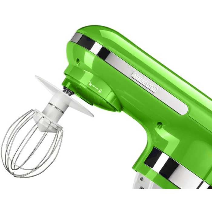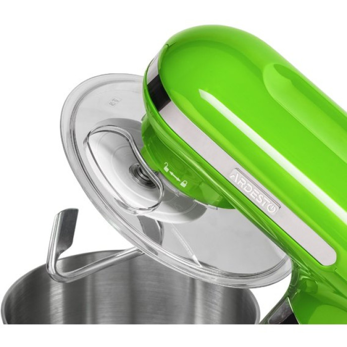 Міксер виконаний в ергономічному корпусі із міцного пластику та доповнений хромованими елементами. Чаша на чотири літри виготовлена з нержавіючої сталі, а насадки як з пластику, так і з металу. Віночок та А-подібна насадка призначені для збивання крему та інших інгредієнтів з рідкою консистенцією, а гачок для замісу тіста. Знімна прозора кришка захищає від бризок, а для вилучення насадок є спеціальна клавіша. Двигун потужністю 800 Вт захищений від перегріву, передбачено шість режимів швидкості та режим Pulse. Для керування використовується зручний важіль, а для стійкого встановлення є ніжки-присоски.