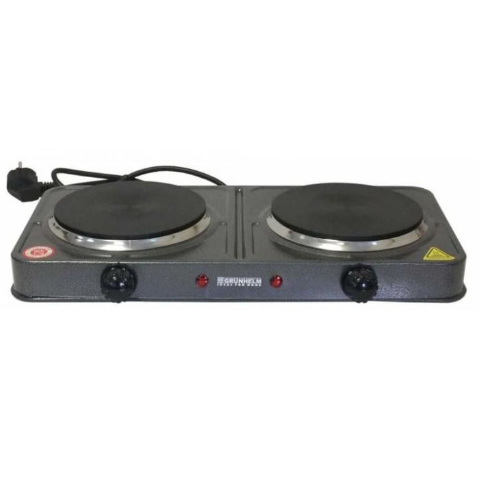 Електроплита Grunhelm GHP-5614 – зручна, мобільна настільна плитка. Оснащена двома конфорками типу «млинець», які порівняно із звичайними ТЕНами, довше тримають температуру і рівномірно розподіляють тепло по поверхні. Завдяки такому рішенню, плитка більш економно та ефективно споживає електроенергію! Діаметр кожної конфорки - 15.5 см. Плитка живиться від побутової мережі 220В, а її максимальна потужність становить 2.0 кВт. Корпус плити виготовлений із холоднокатаної сталі глибокої витяжки, а поверхня покрита термостійкою емалевою фарбою. Такий вид покриття – більш міцний та ударостійкий.