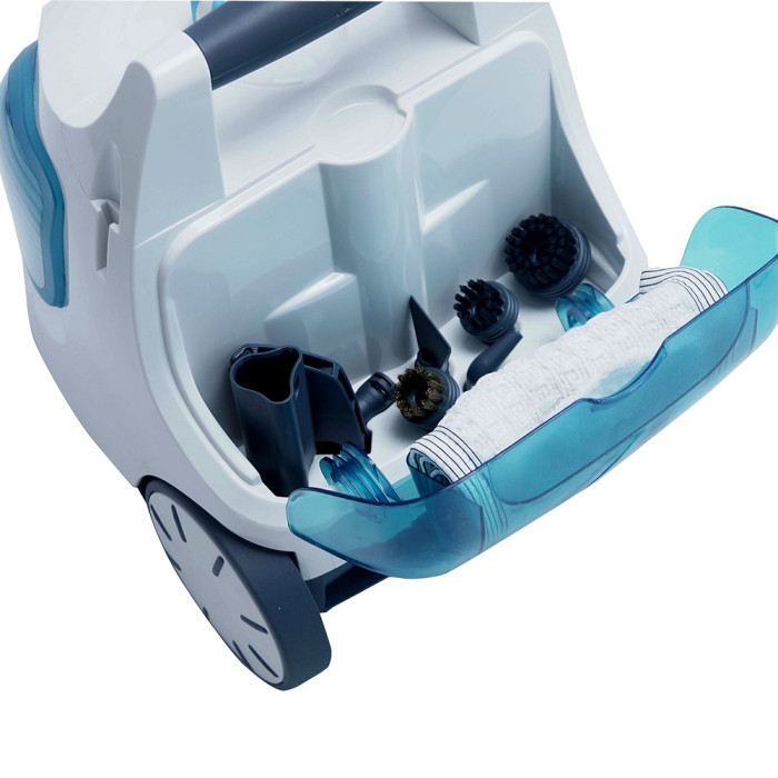 Ідеальне прибирання без використання безлічі різноманітних засобів для чищення - це зовсім не казка. Парогенератор Thomas Vaporo Buggy - потужна професійна модель, яка забезпечить відмінні результати прибирання завдяки силі пари. Прилад легко очистить усі домашні поверхні: плитку, скляні поверхні, паркет, мармур, килими та ін. У спеціальному відсіку Ви знайдете багато корисних аксесуарів. У комплектацію входять точкова насадка, скребок, нейлонові щітки (маленька та велика), металева щітка, насадка для миття вікон, насадка для миття підлог. Така різноманітність насадок дозволить ідеально прибирати у будь-якому приміщенні. Особливістю моделі є можливість приєднання насадки-праски. Для комфортного використання парогенератор оснащений індикатором готовності пари та регулятором його потужності, а також індикатором рівня води.