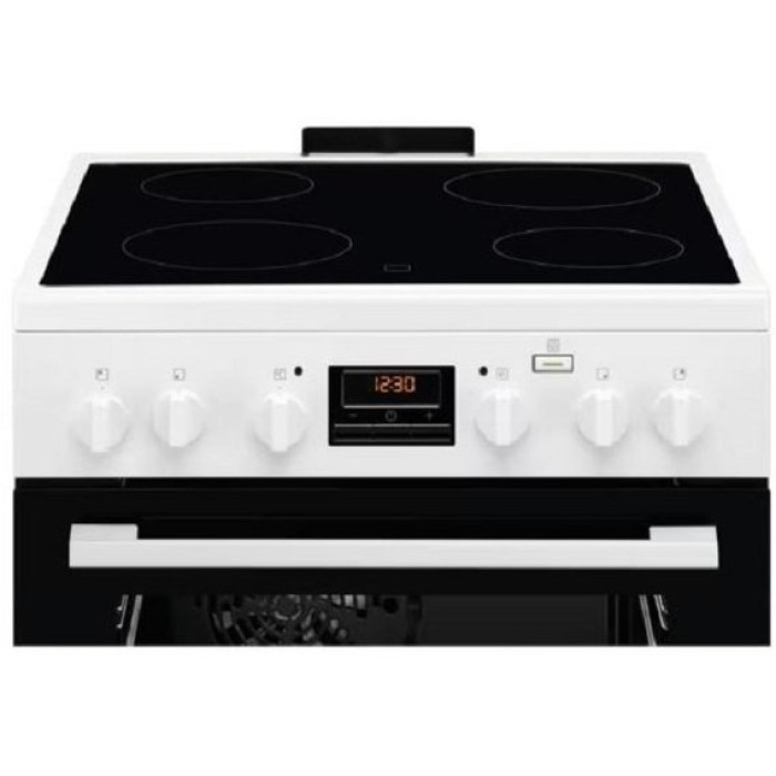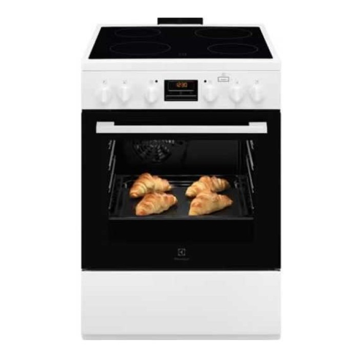Electrolux LKR664100W - електрична плита, склокерамічна варильна поверхня, 4 зони нагріву, об'єм духовки 58 л, гриль, конвекція, дисплей, таймер, поворотні регулятори, каталітичне очищення, ширина 60 см, колір білий.