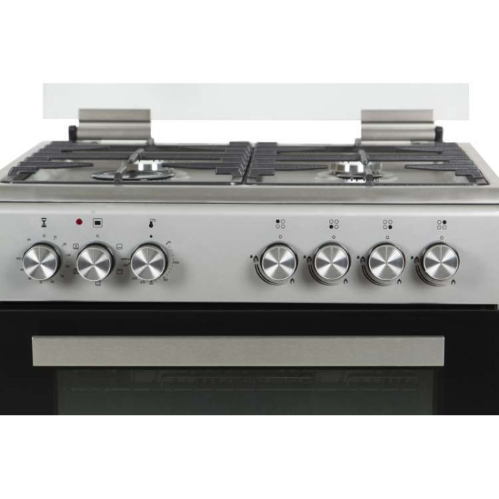Поверхня: нержавіюча сталь, 4 конфорки, електрозапалювання автоматичне, газ-контроль, чавунні грати.