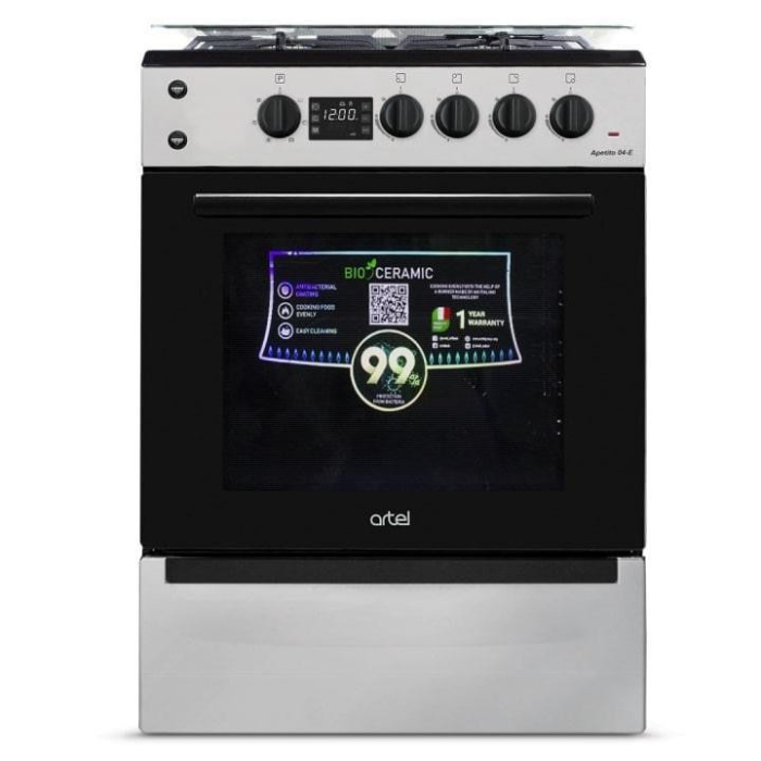 Газова плита Apetito 04-E від узбецької компанії Artel має чотири конфорки, електродуховку з підсвічуванням об'ємом 65 літрів та функцію електричного грилю.