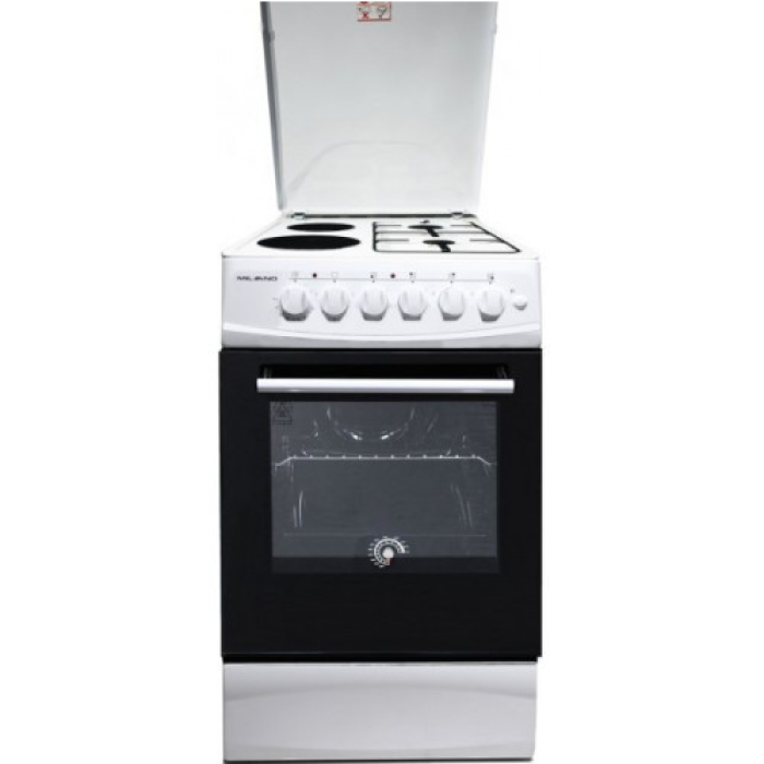 Газова плита ML50 E22 від грузинської компанії MILANO оснащена двома газовими конфорками та двома електричними млинцями. Об'єм духовки складає 52 літри. Модель має емальовані грати та металеву кришку варильної поверхні.