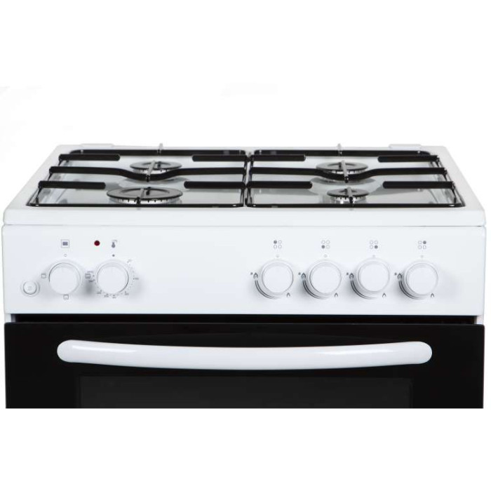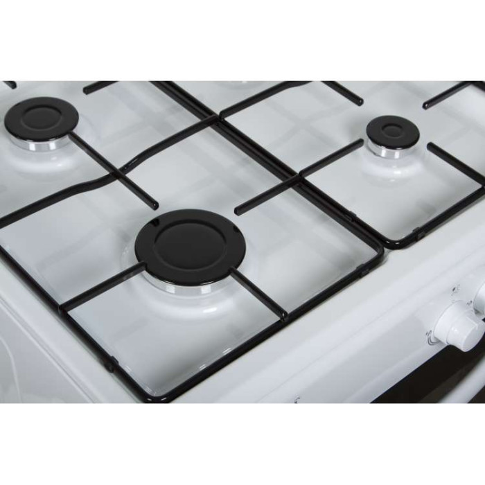 Модель виготовлена з емальованої сталі білого кольору, що робить досить універсальним рішенням для кухні. Зверху розташована газова варильна поверхня із 4 конфорками.