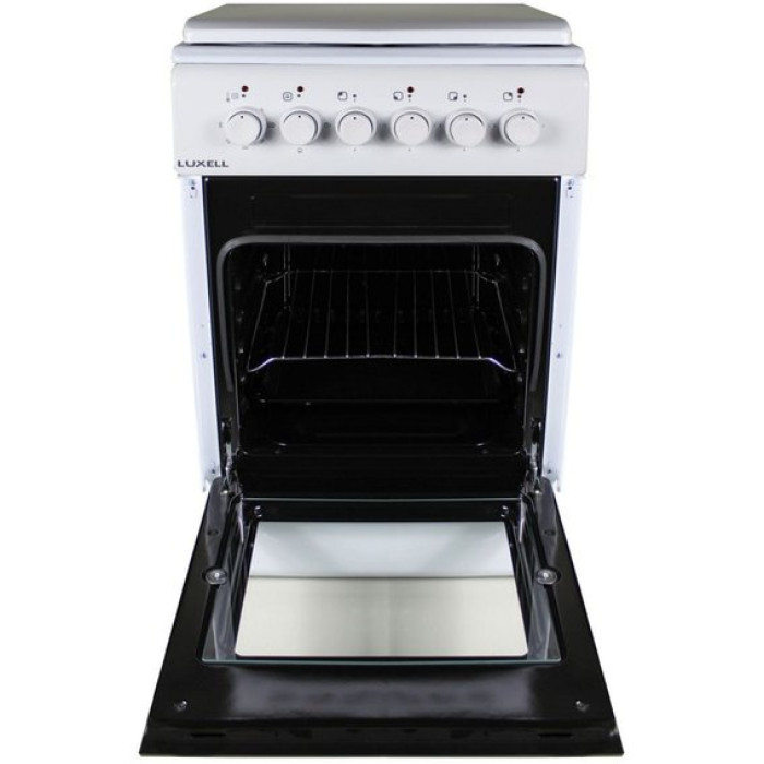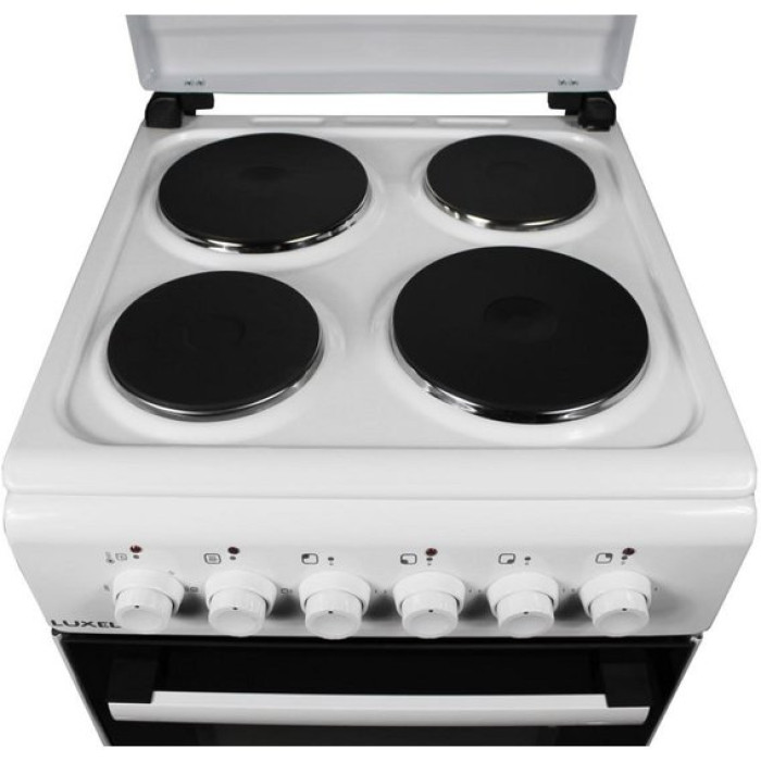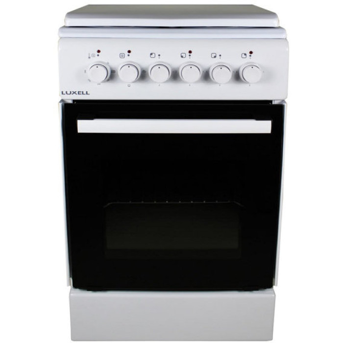 Електроплита LUXELL LF55S-04 має чотири електричні зони нагріву на робочому столі. Керуються конфорки поворотними ручками на передній панелі. Там же розташовані індикатори роботи духовки та конфорок робочого столу.