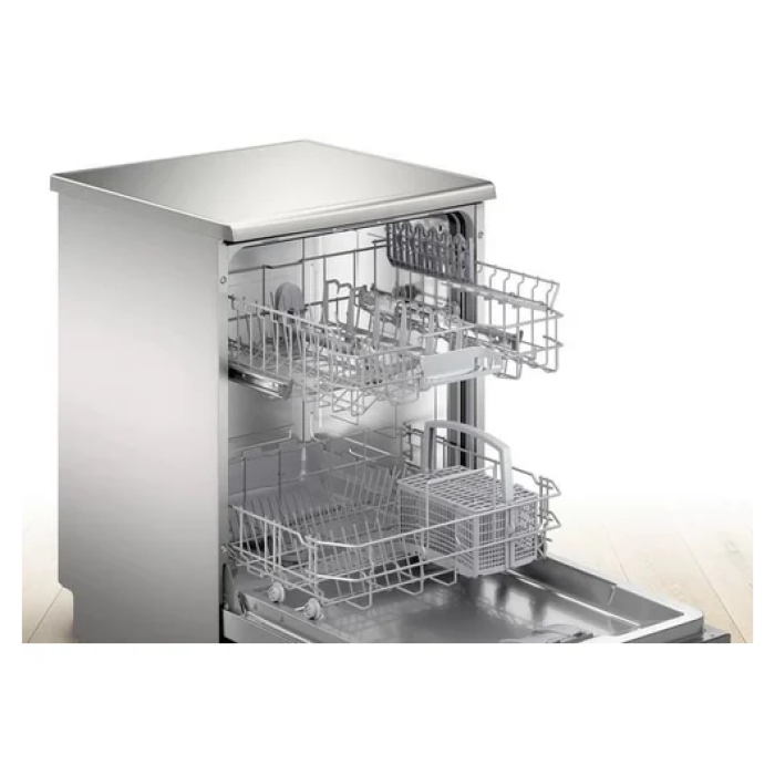 Посудомийна машина Bosch SMS25AI01K є окремим агрегатом, виготовленим у сучасному дизайні з лакованою поверхнею стильного кольору нержавіючої сталі.Вона розрахована на одноразове завантаження 12 комплектів посуду, для чого потрібно 10,5 літрів води.У моделі класу енергоспоживання А+ встановлений надійний та економічний безщітковий двигун, рівень шуму якого не перевищує комфортні 48 дБ.Раціональному розміщенню підготовленим для миття виробам із різних матеріалів та різного розміру сприяє механізм Rackmatic.З його допомогою верхній кошик, навіть заповнений, може пересуватися по висоті трьома ступенями по 5 см. Технологія ActiveWater забезпечує ефективне використання ресурсів незалежно від кількості та ступеня забруднення завантаженого кухонного начиння.Посудомийна машина Bosch SMS25AI01K оснащена вбудованими автоматичними програмами, що реалізують різні режими функціонування, та таймером.Вона керується електронною панеллю із цифровим дисплеєм.