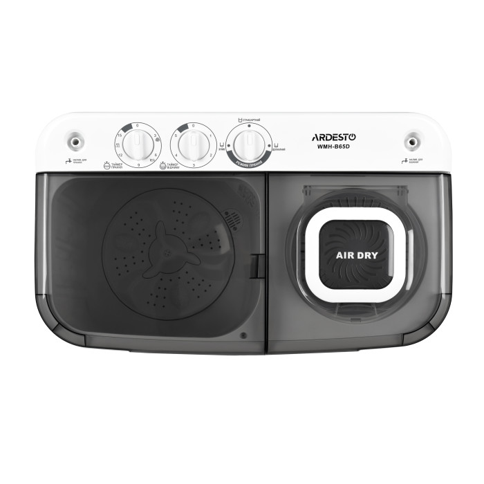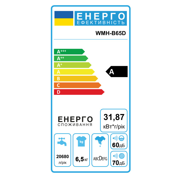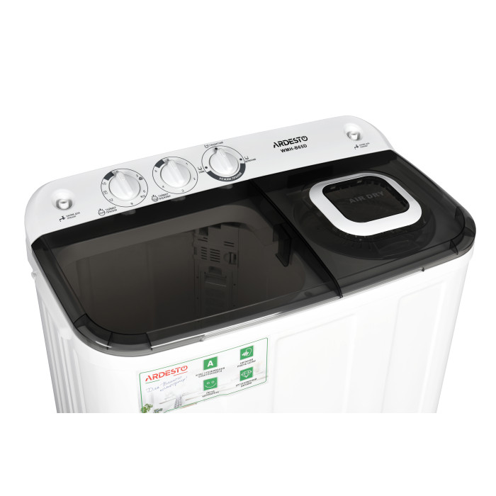 Напівавтоматична пральна машина з вертикальним завантаженням білизни та центрифугою для віджиму. Об'єм бака - 6,5 кг. Таймер прання розрахований на 15 хвилин та на 5 хвилин для віджиму. Клас енергозбереження – A. Є два режими прання – делікатне та звичайне, а також передбачена функція реверсу. Вага WMH-B65D складає 18.5 кг.