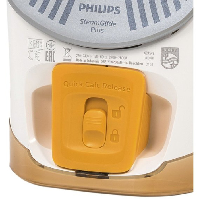 Висока надійність парової праски зумовлена системою захисту від вапняного нальоту Quick Calc Release. Після автоматичного чищення парових каналів весь зібраний накип відправляється в знімний контейнер, який потрібно час від часу чистити. Модель працює з потужністю 2500 Вт, забезпечуючи паровий удар у межах 200 г/хв. Це одна з найпродуктивніших і найнадійніших прасок у серії прасувальних систем Azur.