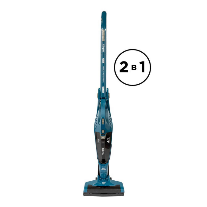 Пилосос 2в1 (вертикальний + ручний) Rotex RVH60-B Turbo Flex виконаний в елегантному сучасному дизайні в синьому та чорному кольорах. Він живиться від літій-іонного акумулятора ємністю 2200 мАг і напругою 22,2 В. Повністю заряджена батарея забезпечує 40 хвилин безперервної роботи, після чого потрібна 4-годинна зарядка. Апарат служить для сухого прибирання у місцях, де відсутня стаціонарна електрична мережа. Потужність пристрою становить 120 Вт, а максимальна потужність всмоктування – 45 Вт. Регулювання потужності виконується ергономічним перемикачем на ручці. Зібране сміття накопичується в півлітровому контейнері, який легко від'єднується і звільняється. Для якісного очищення прилад комплектується 4 насадками, серед яких слід виділити турбощітку з яскравим LED-підсвічуванням. Пилосос 2в1 (вертикальний+ручний) Rotex RVH60-B Turbo Flex функціонує з низьким рівнем шуму – до 75 дБ та паркується у вертикальному положенні.