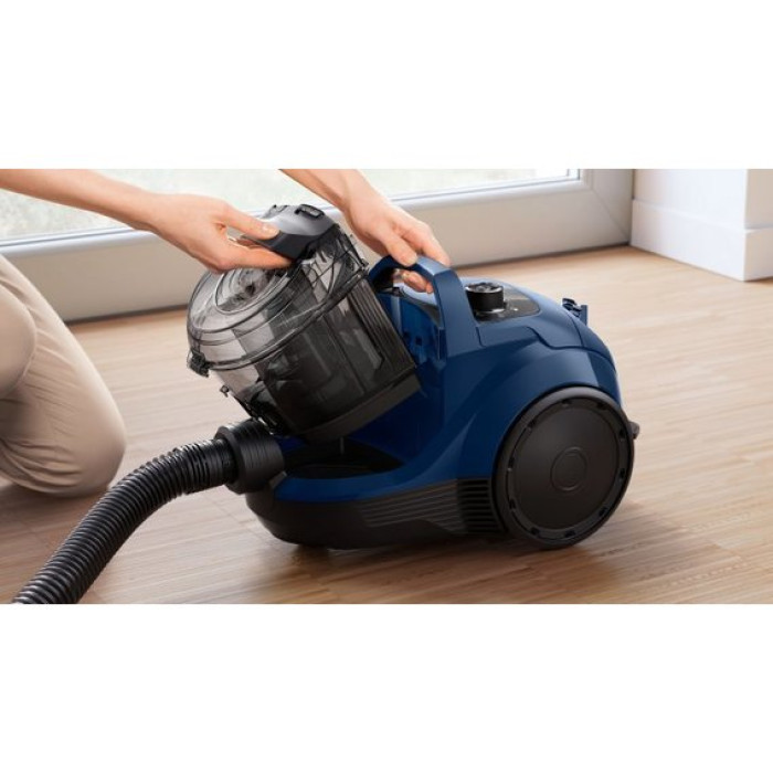 Безмішковий пилосос Bosch BGS21X320 виготовляється в сучасному дизайні в чорному та синьому кольорі. У ньому встановлений електродвигун потужністю 550 Вт із продуктивною аеродинамічною системою HighPower Airflow. Модель служить для сухого прибирання та укомплектована чотирма насадками, серед яких слід відзначити регульовану роликову насадку для твердих поверхонь. Всмоктування сміття проводиться циклонною технологією Power AirCycle, яка використовує потрійну циркуляцію повітря. Пил і сміття накопичуються в контейнері об'ємом 2 літри, який легко знімається та зручно випорожнюється. Чистоту атмосфери в кімнаті під час роботи підтримує фільтр повітря, що виходить НЕРА 13 – він затримує дрібний пил, шкідливі бактерії та побутові алергени. Керується безмішковим пилососом Bosch BGS21X320 поворотним регулятором PowerControl, який розташований на корпусі, а зберігається пристрій у вертикальному або горизонтальному положенні.