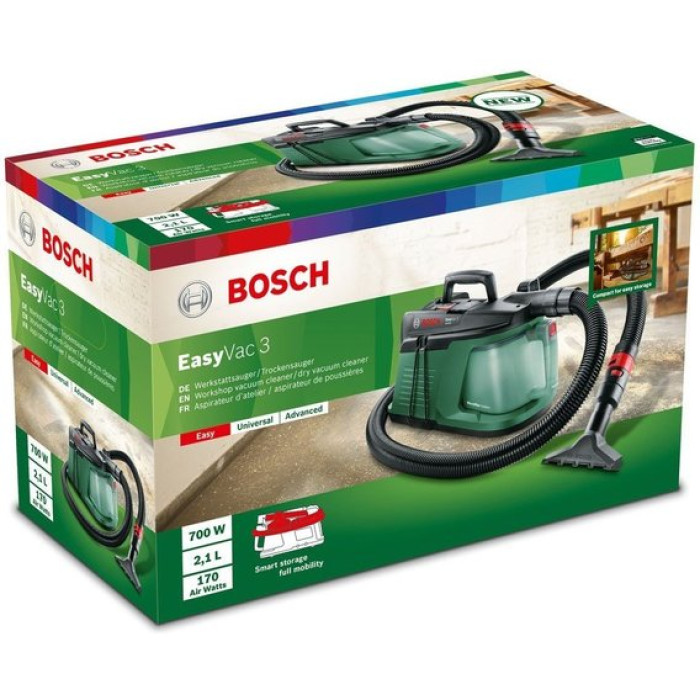 Bosch EasyVac 3 – це компактний та легко транспортабельний пилосос, який оснащений ергономічною ручкою. Легко виймати та очищати контейнер для пилу. Прозорі стіни полегшують контроль заповнення.