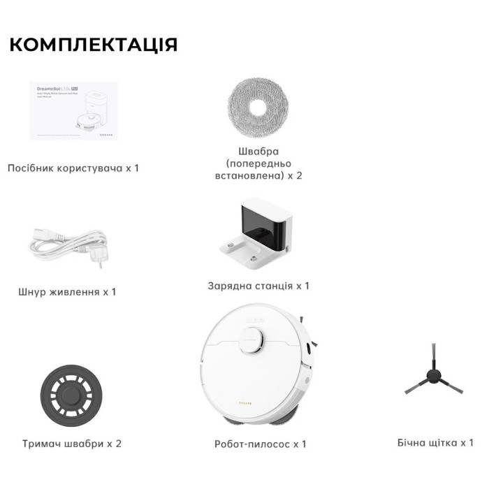 Бічна щітка, Модуль для миття х 2, Гарантійний талон, Зарядна док-станція, Інструмент для чищення пристрою, Кабель живлення, Насадки для миття підлоги х 2, Пилозбірник, Робот-пилосос миючий, Посібник користувача, Щітка гумова (V-подібна)