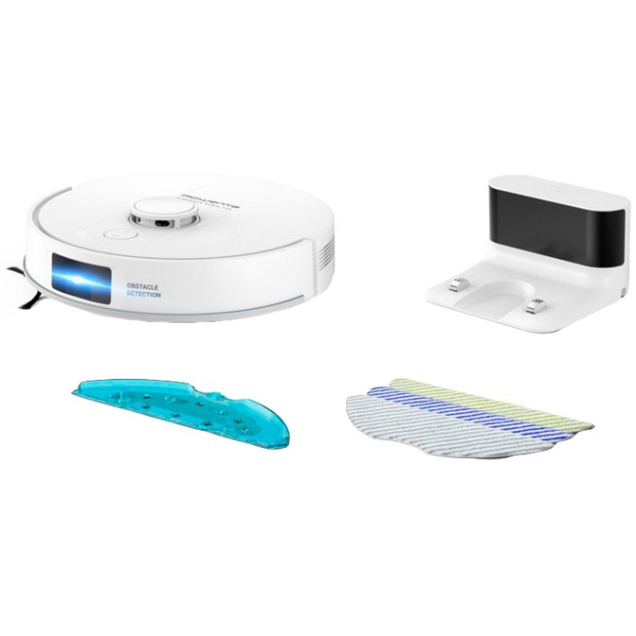 Робот-пилосос, Насадки з мікрофібри для вологого прибирання (2 шт) та для сухого прибирання (1 шт), Док-станція зарядки та самоочищення, Змінні мішки (3 шт), Мультитул для чищення, Інструкція