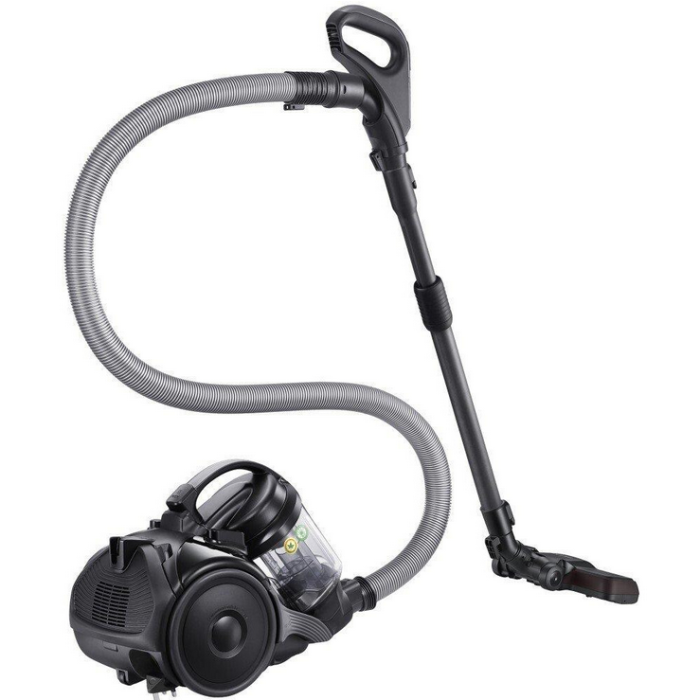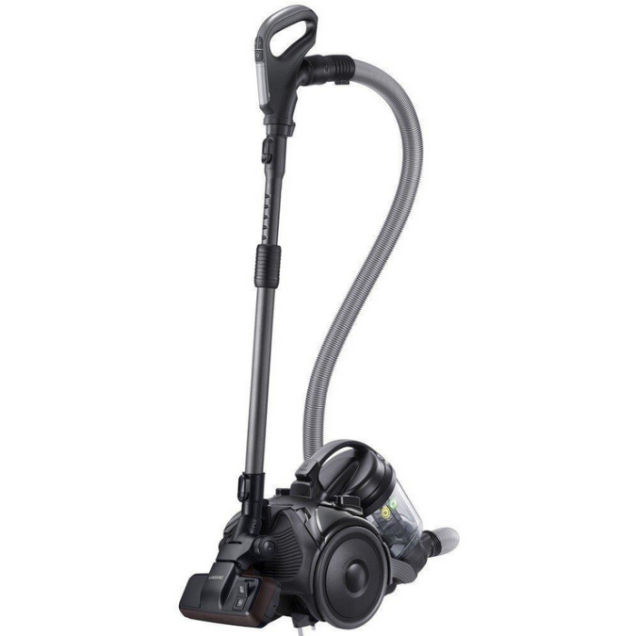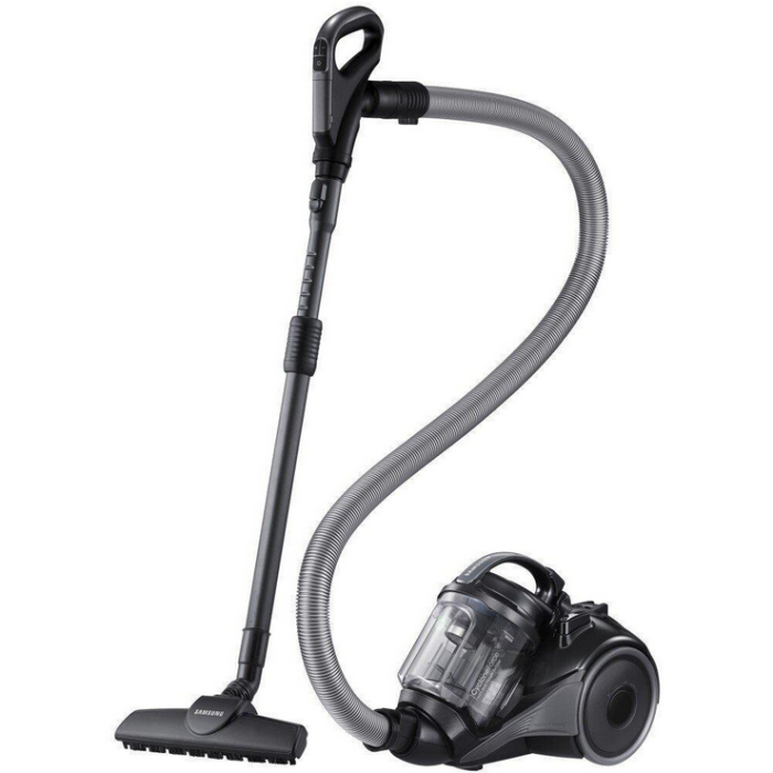 Пилосос безмішковий Samsung VC05K41H0HG виконаний у сучасному елегантному дизайні у стильному чорному кольорі. У мережному пристрої, призначеному для сухого прибирання кімнат, застосовано електродвигун потужністю 550 Вт. Модель оснащена циклонною системою всмоктування та технологією Anti-Tangle. Все зібране сміття накопичується в контейнері об'ємом 1,3 літра, який легко знімається та гігієнічно звільняється від вмісту. Набір з п'яти насадок дозволяє швидко та ефективно очистити від пилу та сміття найважчі місця. Особливо слід виділити турбощітку, що збирає волосся і шерсть свійських тварин, і спеціальну насадку для паркету. Чистота атмосфери в приміщенні підтримується за допомогою НЕРА-фільтра, який затримує дрібні частинки пилу та алергени, що містяться в потоці повітря, що виходить. Безмішковий пилосос Samsung VC05K41H0HG підключається до мережі шнуром живлення довжиною 7 метрів, а його радіус дії становить 10 метрів.