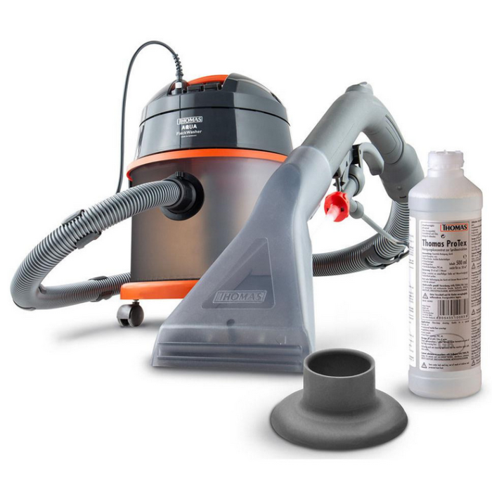 Thomas AQUA FleckWasher - пилосос для видалення плям та сильних забруднень з килимів та м'яких меблів. Гігієнічне очищення сифонів без хімії. Вологе чищення текстилю з Thomas AQUA FleckWasher за ефективністю можна порівняти лише з пранням. Під час вологого прибирання знищуються пилові кліщі та інші шкідливі мікроорганізми, які живуть у меблів та матрацах, видаляються плями та стійкі забруднення. Після миття текстильні поверхні виглядають як нові! Швидке прочищення сифонів без хімії!