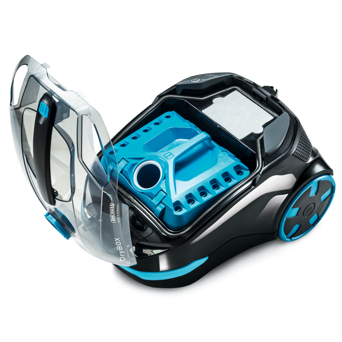Вибираючи зручний пилосос, зверніть увагу на Thomas DryBox (786553) потужністю 1700 Вт. Варто виділити його плавне електронне керування Touch Tronic, яке дозволяє вибирати потужність відповідно до завдання, при цьому постійна потужність всмоктування допоможе прибрати все сміття за один прохід. Захований усередині пилососу пилозбірник розділений на три камери, так що дрібний пил і велике сміття потрапляють у різні відділення, що полегшує чистку контейнера. Для якісного сухого прибирання пропонуються на вибір такі насадки, як насадка, що перемикається підлога/килим, пензлик, щілинна насадка 220 мм, насадка для м'яких меблів, що розпрямляє ворс оббивки. Після закінчення прибирання ви зможете швидко прополоснути фільтр НEPA під краном. Також для вашого комфорту в пилососі Thomas DryBox (786553) передбачено автоматичне змотування шнура, який забезпечує радіус збирання близько 9 метрів, та гарна маневреність завдяки роликам.